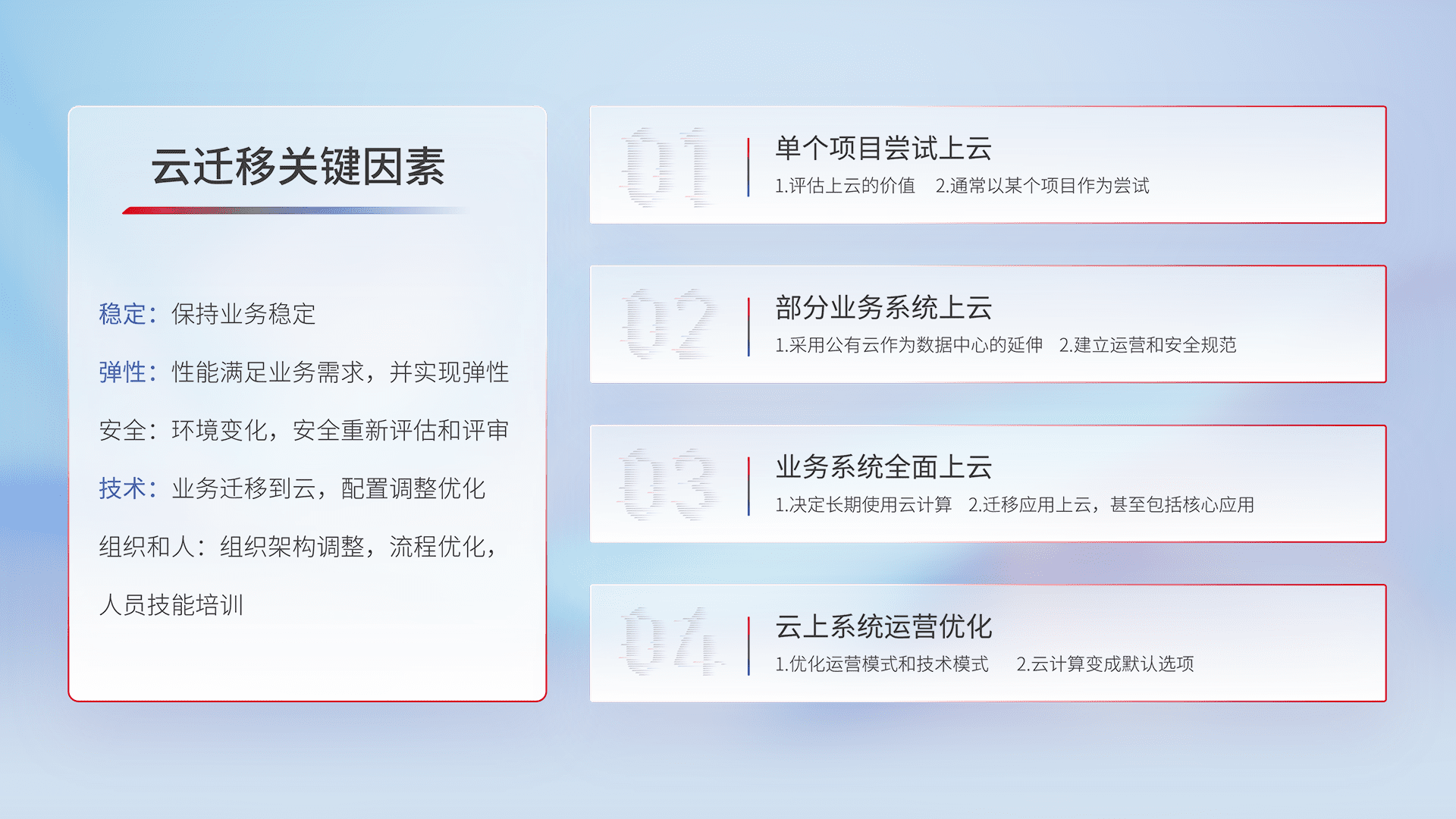 结合实际业务,,,从规划设计、、、云平台选型、、云原生改造、、数据迁移、、、集成交付,,,迁移全过程为客户识别最佳上云路径,,做好风险识别管理,,,,设计网络架构、、、、身份权限、、、、安全审计合规、、、操作审计、、、日志审计、、、、监控告警策略、、、、多站点容灾设计等,,,对云上基础设施进行整体规划,,提升IT治理水平,,,,以满足弹性、、、、高可用、、、高性能的需求。。。