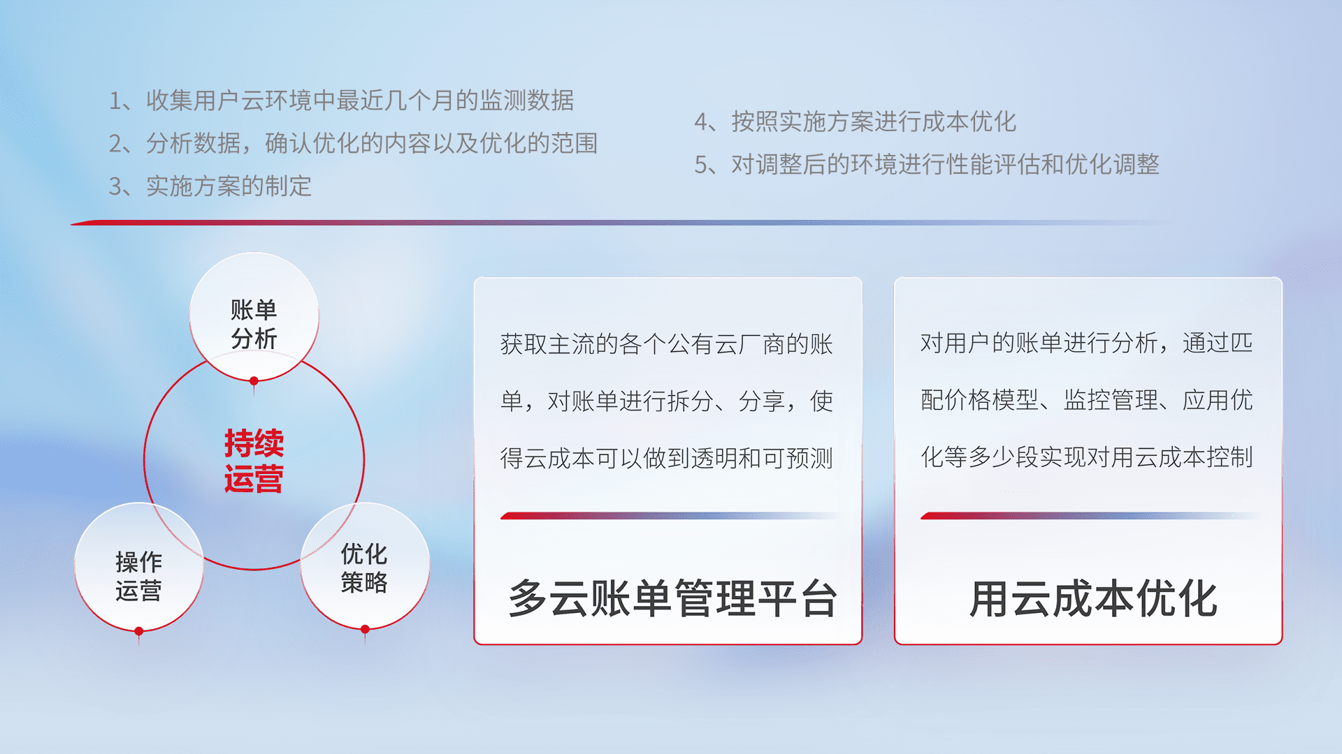 通过多云纳管,,,以统一的资源数据模型把客户的云资源进行抽象和封装,,,,进而实现对多云资源的统一操作,,保障云资源管理的可靠性、、、稳定性与可用性。。。量身定制化运维内容,,配置、、开发运维、、、、补丁管理、、备份、、监控、、认证和访问管理、、、审计和日常巡检等,,保障在用云过程中的可靠度,,,,稳定度以及高可用率。。。。